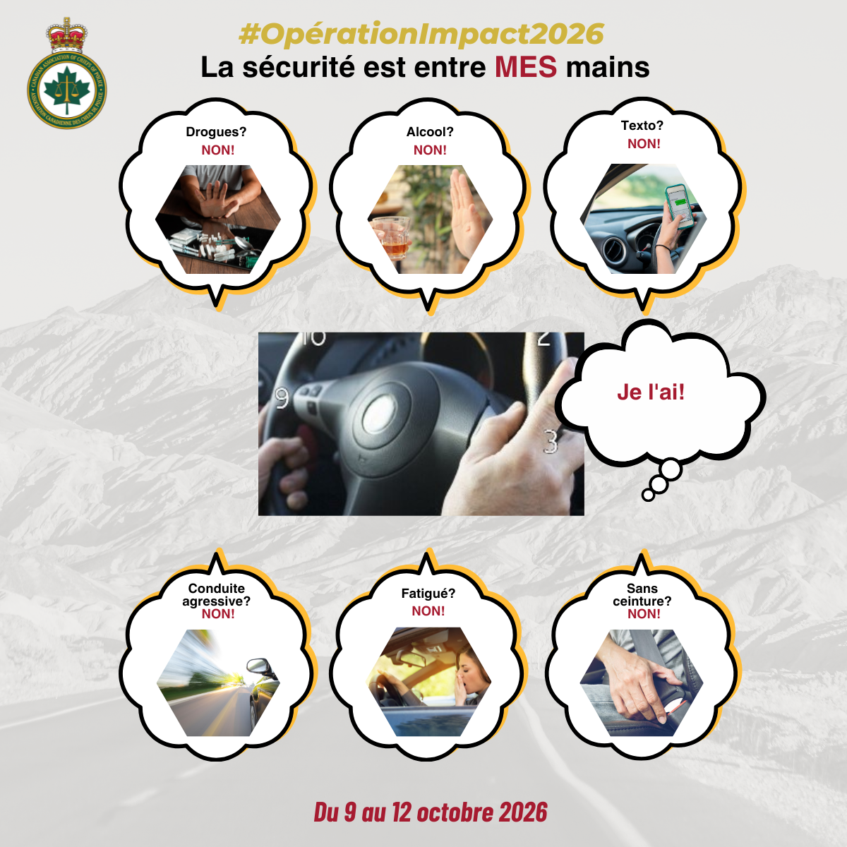 Opération Impact est une campagne de sensibilisation qui sera menée pendant la longue fin de semaine de l'Action de grâce. Cette campagne met l’accent sur l'éducation et l'application de la loi à l’égard de la conduite avec les facultés affaiblies par l'alcool, la drogue, et la fatigue, la conduite agressive, la distraction au volant, ainsi que l'usage de la ceinture de sécurité et des sièges pour enfants. Il s'agit des principales causes de décès et de blessures sur les routes canadiennes.